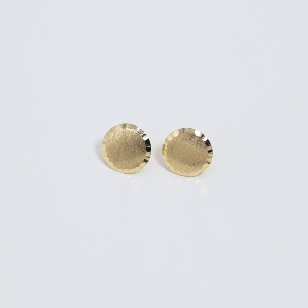 The Alice Earrings are classic round stud earrings crafted in 18k yellow gold. They feature a subtly textured surface that catches the light, adding a touch of understated elegance to a timeless design.