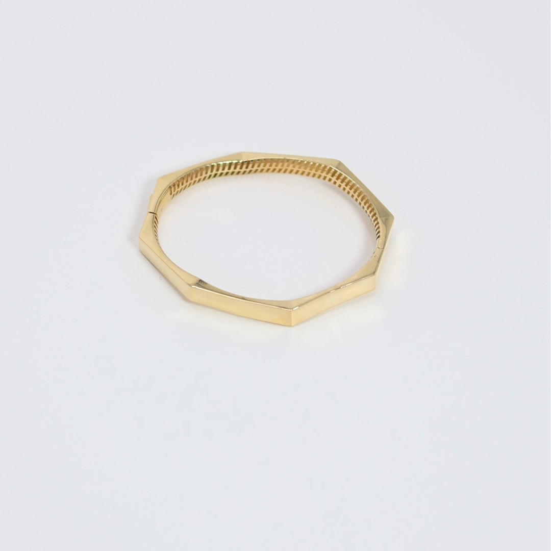 Add a touch of geometric elegance to your wrist with the Britney Bracelet, featuring a unique hexagonal design that offers a modern and sophisticated look. This bangle is perfect for stacking or wearing alone as a statement piece, adding a touch of contemporary style to any ensemble.