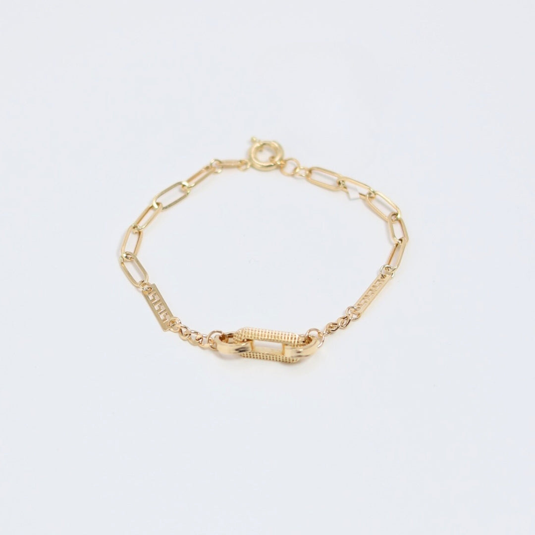 Delicate 18k gold paperclip link bracelet with a textured center detail. The Gracy Bracelet features a modern design with a unique, statement clasp.