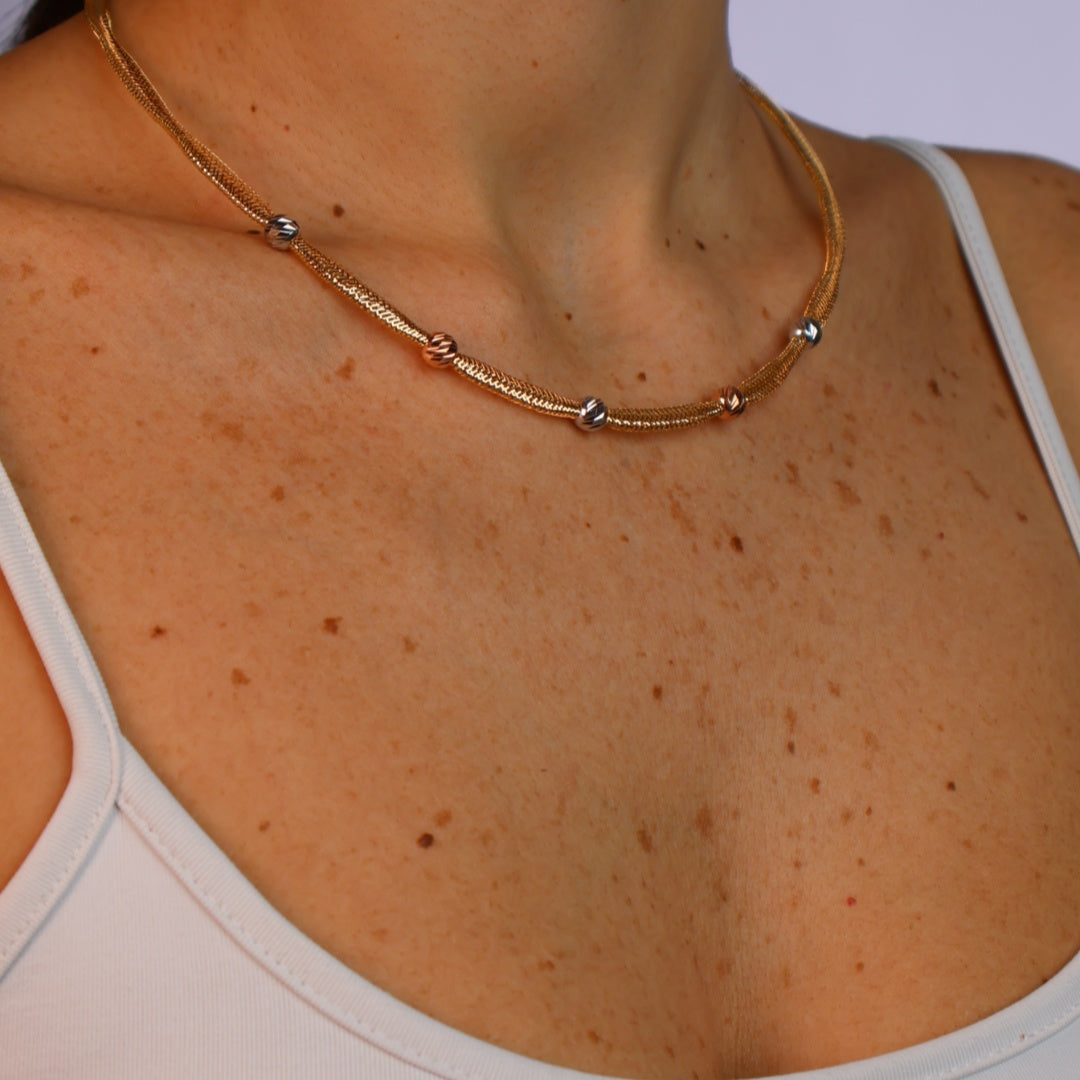 Introduce a touch of multi-dimensional elegance with the Kendel Necklace, featuring a textured mesh chain accented by tri-tone gold beads. This piece offers a unique and eye-catching design, perfect for adding a sophisticated sparkle to any ensemble.