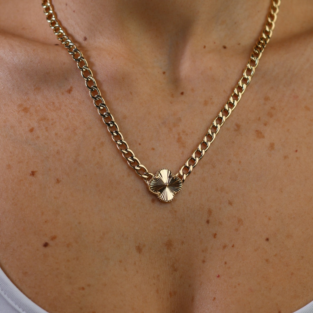 Add a touch of subtle charm with the Laura Necklace, featuring a delicate curb chain accented by a petite, textured clover pendant. This piece offers a refined and feminine design, perfect for adding a touch of understated elegance to your everyday look.