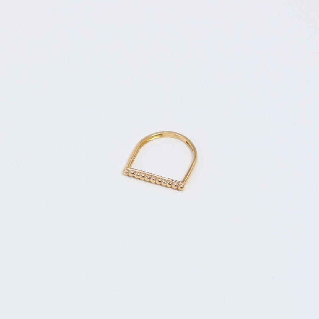 The Rhys Bar & Bead Ring offers a minimalist design with a touch of texture. It features a thin, open band with a horizontal bar detail. The bar is adorned with a row of small, evenly spaced beads, adding a subtle touch of detail to the piece. This ring is perfect for stacking or wearing alone for a delicate, modern look.