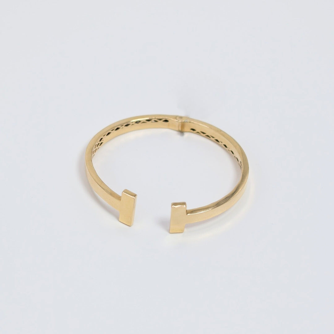 The Sawyer Bangle Bracelet offers a sleek and contemporary design with a distinctive "T" motif. It features a slim, open bangle with two "T" shaped ends that create a modern, minimalist look. This bracelet adds a touch of understated elegance to any outfit.