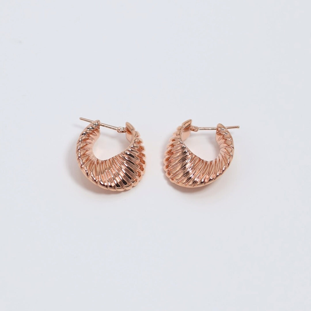 The Sovanna Earrings are charming small hoop earrings with a distinctive ridged or fluted texture that curves along their semi-circular shape. Crafted in a warm rose gold tone, they add a touch of subtle detail and catch the light with gentle dimension.